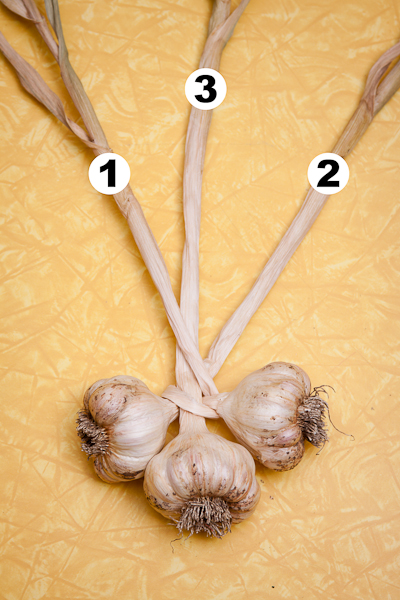 I select my largest heads of garlic for replanting and for braiding. I have already set aside my bulbs that I will replant, so the rest are for braiding. I started with 13 heads, but I suppose you could do more (I’m thinking your braid would just be thicker due to more stems).