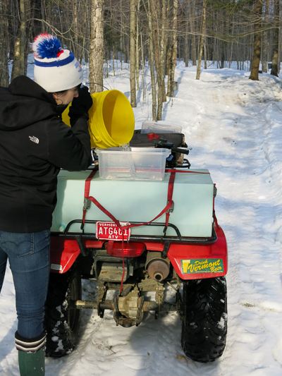 When the sap from John’s first gather started running low, Matt and I took the ATV out to check the buckets again.