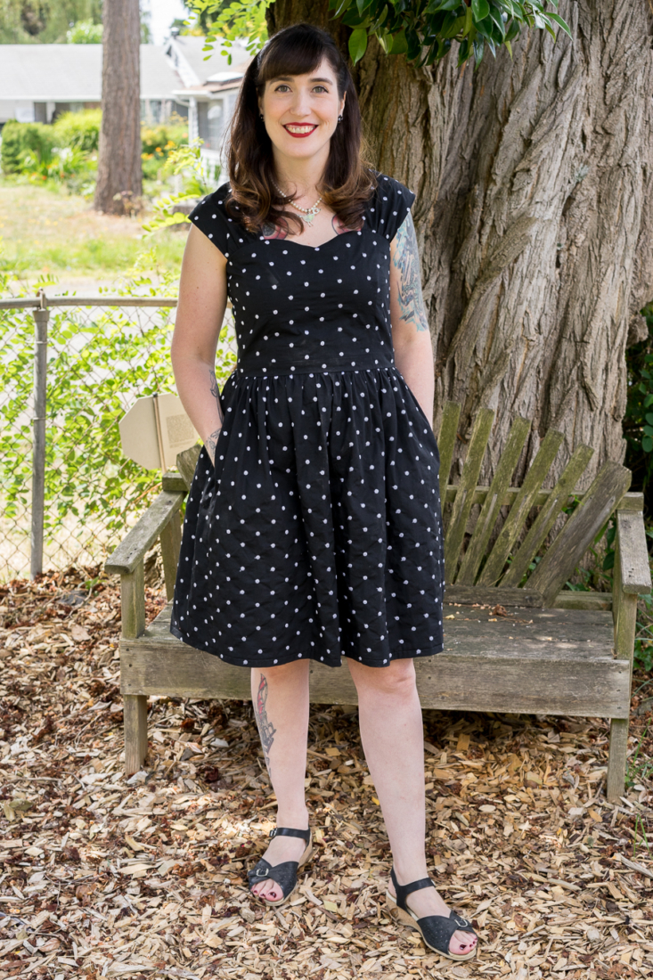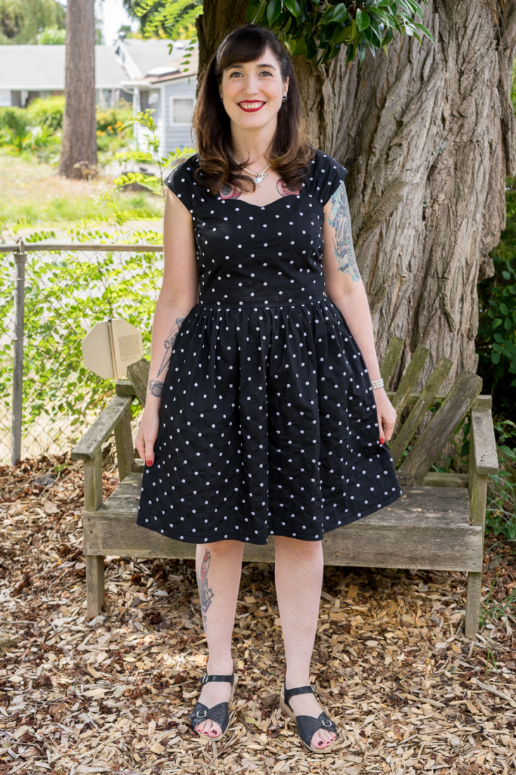 Fabric- I’m not sure if this fabric qualifies as Swiss Dot or not, but it is basically a light-weight black cotton with embroidered white dots on it. I think I got it at Pacific Fabrics. It was bought to be a Cambie, but has been sitting in my stash for years.