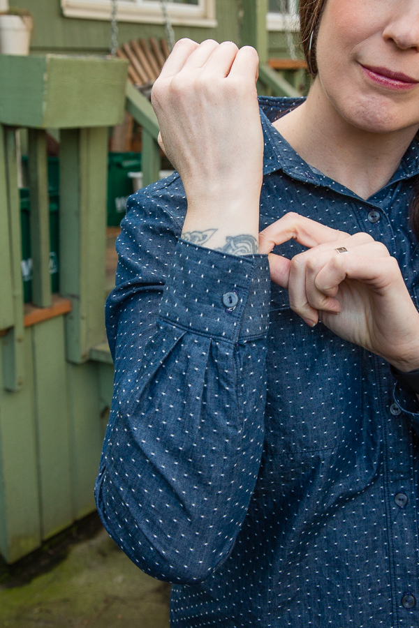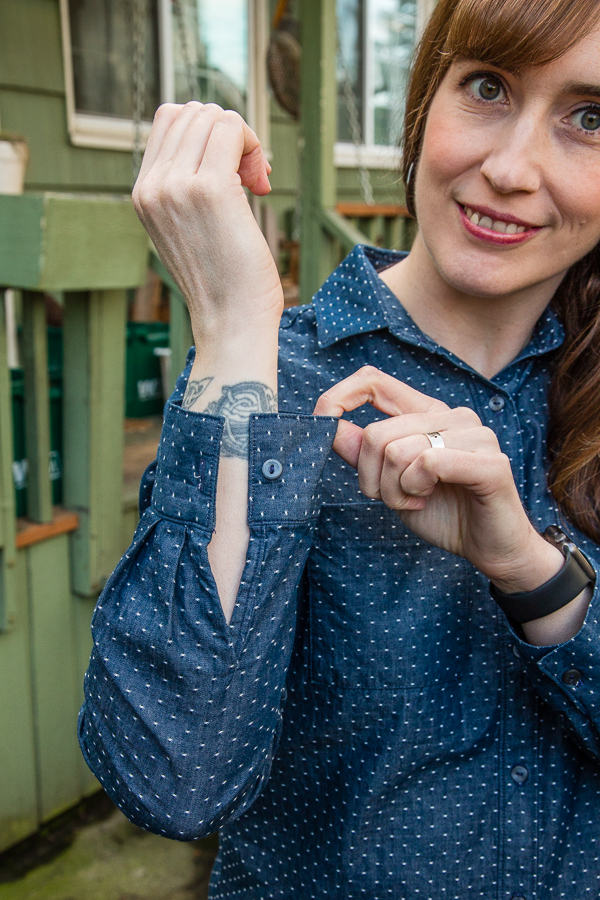 Something to note is that you also have to make sure you sew the cuff on a certain way or the placket won’t overlap correctly when buttoned. One side of the placket folds under and one stays out flat. The side that folds under is where your buttonhole goes since that will be on top as pictured above. I found that to be a little confusing my first time, so if you are about to sew the Archer Button Up for the first time or have been confused by this as well, hopefully this is helpful!