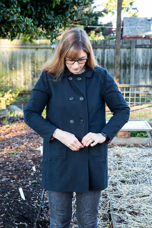 So you’re probably think that the buttonhole debacle is the end of the story, but it’s not. I had another challenge ahead; getting photos of it. The days were getting shorter, darker, and more rainy, so the opportunities to shoot outdoors were few and far between. I had been waiting so long to finish this coat, that I sure as shit wasn’t going to wait any longer to wear it. I could imagine waiting so long to photograph it that it would be summer again by the time I did and then I would have to wait a whole year longer to wear it. Nope, I was wearing it.