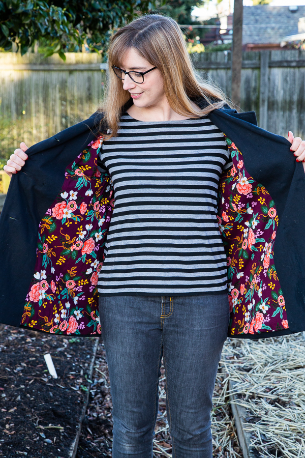 In the end, everything turned out fine and this coat was well worth the wait. It’s been a pretty mild winter here in Seattle, so I am still getting to wear it. It layers well over a sweater and with some mitts and a beanie, I am quite comfortable. I am so happy I decided to go with a basic black too, because I can wear it with anything, yet I still have a fun lining. The lining is rayon and allows the sleeves to slide on nicely. It even seems like it might add a little warmth. It definitely has a nice weight.
