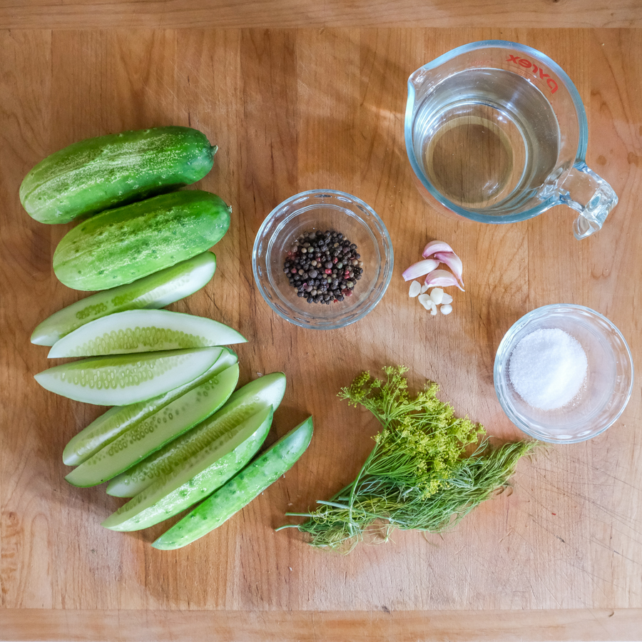 - 2-3 medium pickling cucumbers (approx. 5″ in length), quartered lengthwise- If smaller just use more!