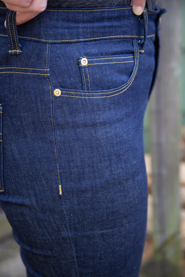 - My machine started acting really wonky and skipping stitches when I went to topstitch the fly (of course). I did everything to try to fix it too. I rethreaded my machine, changed the needle, did test piece after test piece where it would work and then I would try it on the actual jeans and it would still be skipping stitches. I even tried it on another machine. I would have kept trying to fix it, but I could’t figure out what it was and the fabric was on the verge of looking ragged, so I finally just left it. Maybe it was just the limit of what my mid to low-end machines could handle and the fabric was too thick there. Would a walking foot have helped, perhaps?