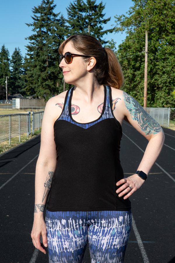I feel like the fit is good, as in I picked the right sizing, but I stretched the binding on the Dunbar Top too much while sewing it, so it gapes at my bust around the armholes. So much of sewing with this type of fabric is getting a feel for how to handle it. I’m sure my next activewear endeavor will go much smoother. Otherwise, the top is wonderful and I absolutely love the built-in shelf bra, which eliminates the need for a sports bra for me. I’m a C-cup, so I’m not sure if this would be enough support for all cup sizes, but for me it works great.