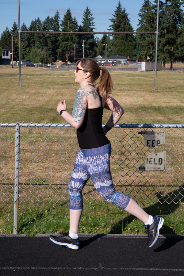 My main complaint with the Pacific Leggings is that for running they don’t stay up as well as I would like. I even tightened the elastic at the waist when I resewed them, so they are better than they were, but they still like to inch downward a bit while I’m running. They seem to pull downward from the calf, so it may be a length issue. I noticed that if I hike the hems up over my calves, they don’t pull down as much. I suppose I could put some of that grippy elastic inside the hems like I have on my cycling pants and see if that helps.