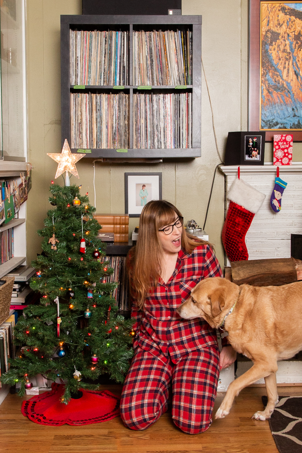 So cozy, I’m jealous (of your fireplace too)! Sadly our tree often comes down before Christmas (since my partner and I travel to visit family in different places) but we put it UP on the early side. 🙂 It never occurred to me to carry the line of the plaid from the top to the bottom but it really pays off! This is a beautiful set of winter PJs!