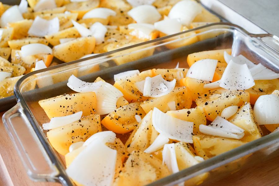I came up with this recipe because I had an abundance of yellow tomatoes. I like the color the yellow tomatoes give, but feel free to make this with whatever color tomatoes you might have.