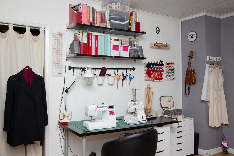 Storage was becoming an issue in my previous studio, so I added more shelving for books, patterns and tubs of things like kits, special fabric, and all of the vintage buttons people keep giving me. I still love my spice rack and jars of (new, matching set) buttons, so that stayed. Other new additions are the Fintorp Series rail and hooks. They are meant for to be wall storage in the kitchen, but work so great for scissors and other sewing tools. If I remember correctly, I bought the regular size thread rack from Pacific Fabrics and the serger spool rack from Joann Fabrics. I also kept my system of storing my “in progress” patterns on coat hooks because that has continued to work well for me.