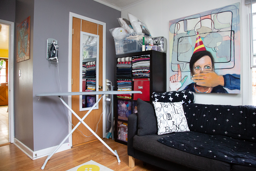 When we have overnight guests, the couch be pulled out into a bed. To protect the couch from Wyatt’s white dog hair, I keep the couch covered with a washable blanket at all times. As a recent napping convert, I have to say I don’t mind having a couch in my sewing space at all. All this creativity can make me a little sleepy sometimes and it turns out this is a great space for a quick, rejuvenating nap!
