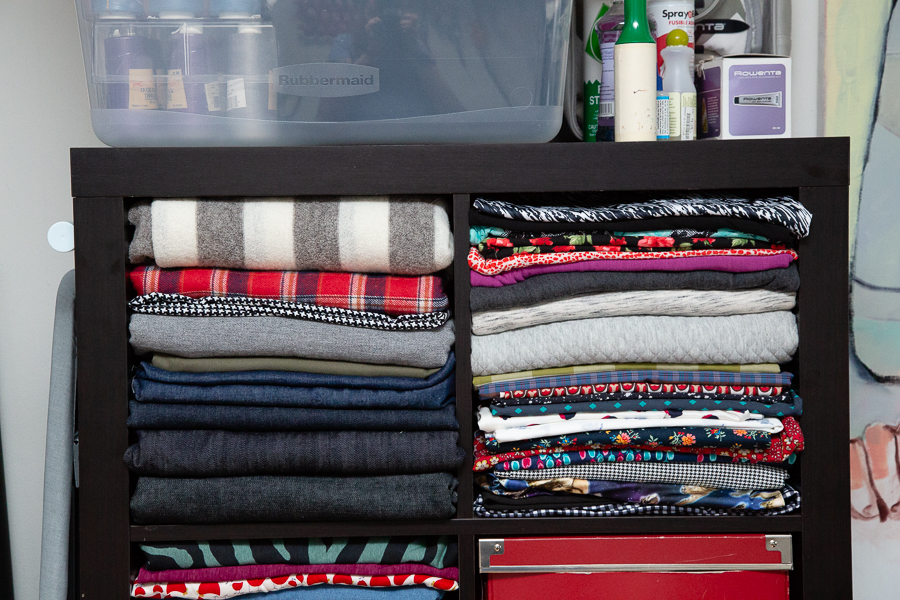 I’ve had this shelf unit for awhile and it also shows the evolution of my hobbies. Whereas it used to house photography and skate stuff, those items don’t get used as much or at all anymore, so have been moved to the closet or basement. The freed up space was quickly taken over by fabric and yarn. It got so full, that I eventually had to go through and fold everything better, so it would all fit. That gave me the opportunity to also organize everything by type (wool, denim, knits, rayon, shirting, etc.), so fabric would be easier to find. They don’t make this exact shelf series anymore, but the Kallax Series was designed to be its replacement and it looks pretty cool too!